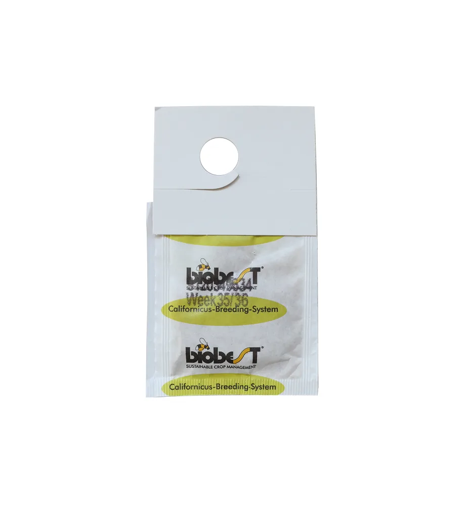 Kaste ar 100 vai 500 papīra maisiņiem, kuros katrā atrodas vismaz 100 Neoseiulus californicus imago (iejauktas klijās kopā ar barību) un no kuriem turpmāko 6 nedēļu laikā iznāk +/- 1000 N. californicus.