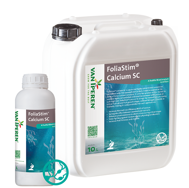 Van Iperen FoliaStim® Calcium SC ir tīra un ļoti koncentrēta suspensija, kas sastāv no 15% jūraszālēm un 28% kalcija (CaO). Pirmais produkts tirgū, kas apvieno ļoti koncentrētas un bioaktīvas jūraszāles ar kalciju tik augstā līmenī. FoliaStim® Calcium SC nodrošina nepieciešamo kalciju kritiskās augļu aizmešanās un augšanas fāzēs, bez nitrātiem, hlorīda vai sulfāta, padarot to par unikālu ārpussakņu mēslojumu.