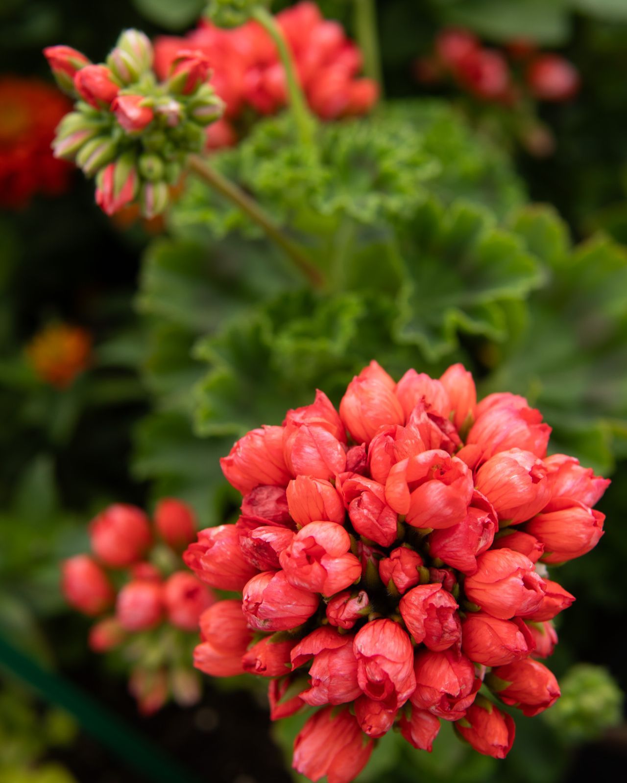 Tulpjziedu pelargonija. Stāvs augums. Daļēji pildīts zieds.