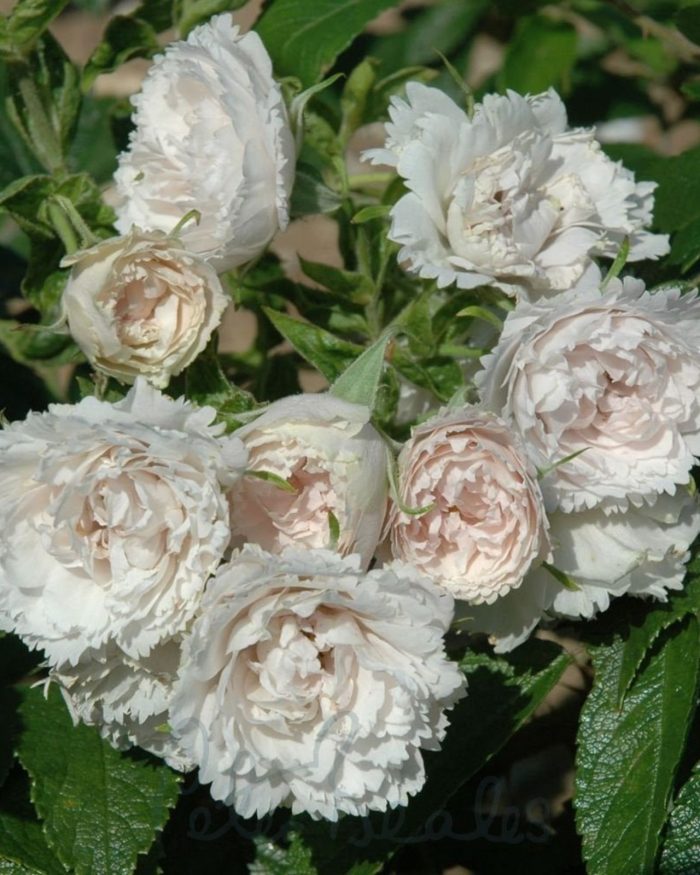 Balti, nelieli, pildīti ziedi. Ziedlapas ir nedaudz šķeltas. Bagātīga ziedēšana līdz pat rudenim. Krūms labi sazarots, izplests ar dzeloņainiem dzinumiem. Pacieš arī nelielu noēnojumu. Divgadīgs kailsaknis. Potēts!